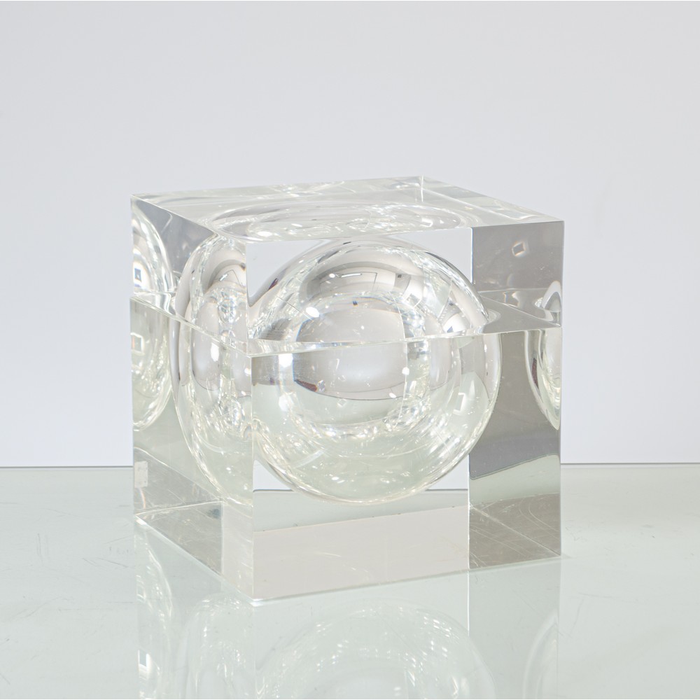 Una scatola cubica con coperchio in plexiglass trasparente con cavità sferica centrale.