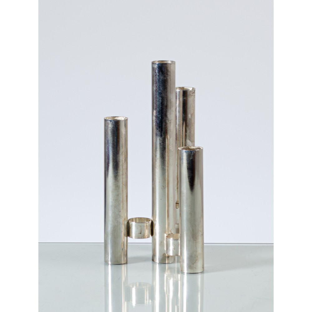 Vaso in acciaio cromato composto da quattro cilindri assemblati con anelli in acciaio.