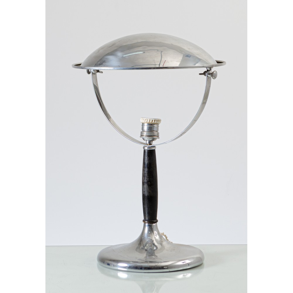 Lampada da tavolo ad una luce, struttura in metallo cromato, fusto verniciato nero, diffusore basculante semisferico in acciaio cromato. Impianto elettrico originale. Segni di uso.