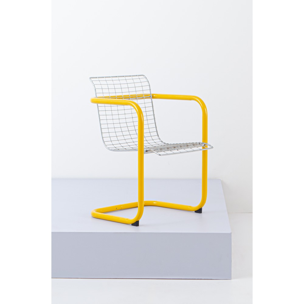 Poltrona con struttura in tondino metallico verniciato giallo, seduta e spalliera in reticolato metallico zincato e curvato.