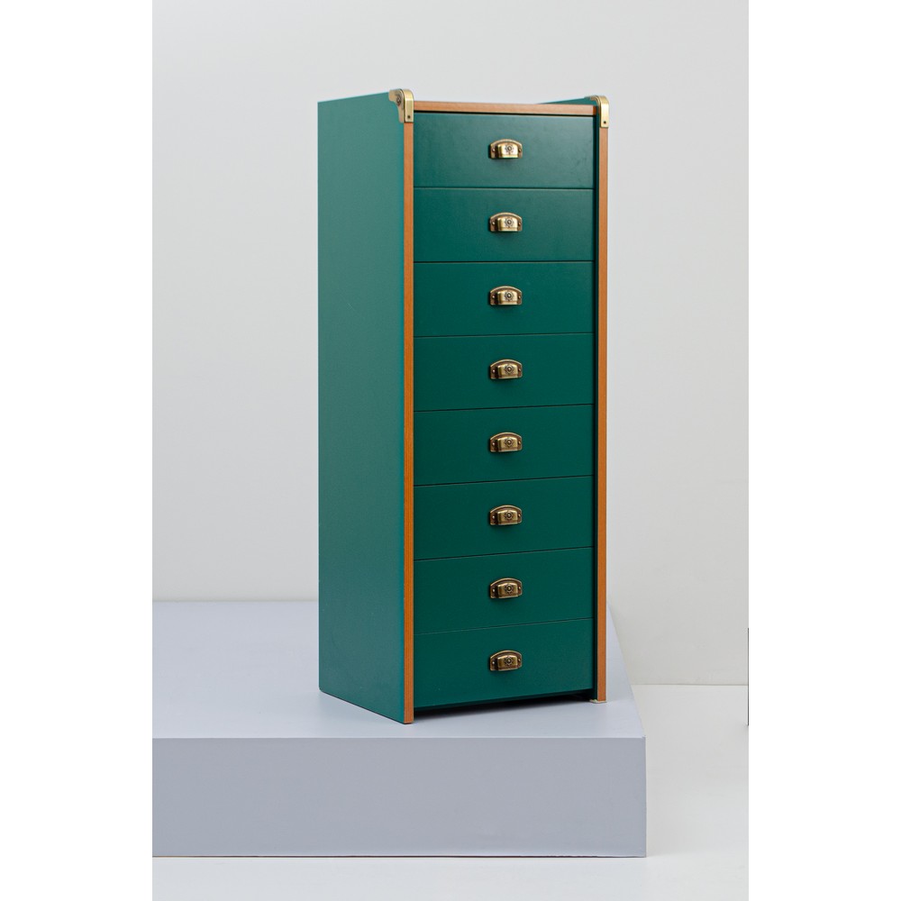 Cassettiera in legno verniciato verde con profili in essenza, otto cassetti, minuterie e maniglie in ottone.
