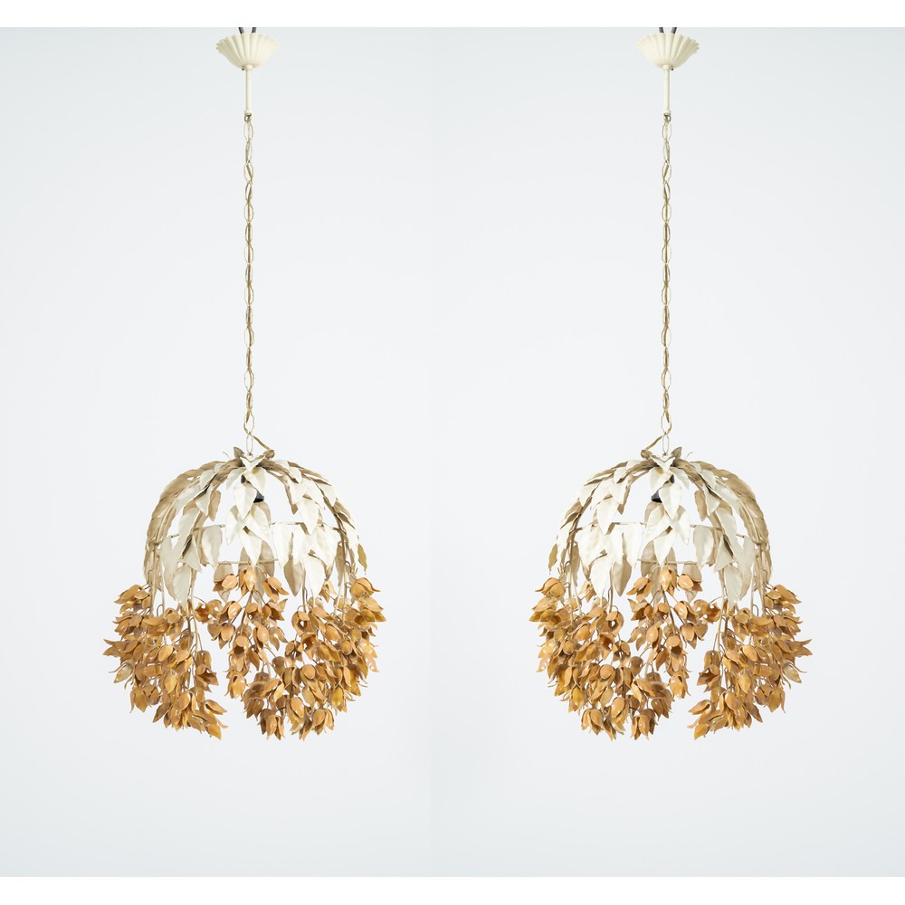 Coppia di lampade a sospensione ad una luce in ferro verniciato avorio e marrone, diffusore semisferico con foglie e fiori. Lavoro artigianale.