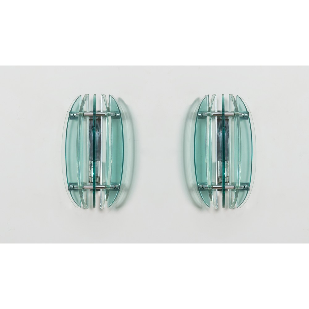Coppia di lampade da parete ad una luce con struttura in metallo cromato, diffusore ovalizzato composto da lastre di vetro trasparente e verde sagomate. Etichetta di produzione.