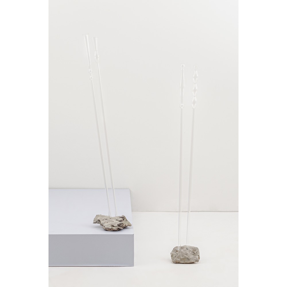 Due portafiori composti da due massi di pietra forata e due lunghe canne in vetro trasparente sagomate nella parte superiore a caldo con diverse forme geometriche.