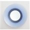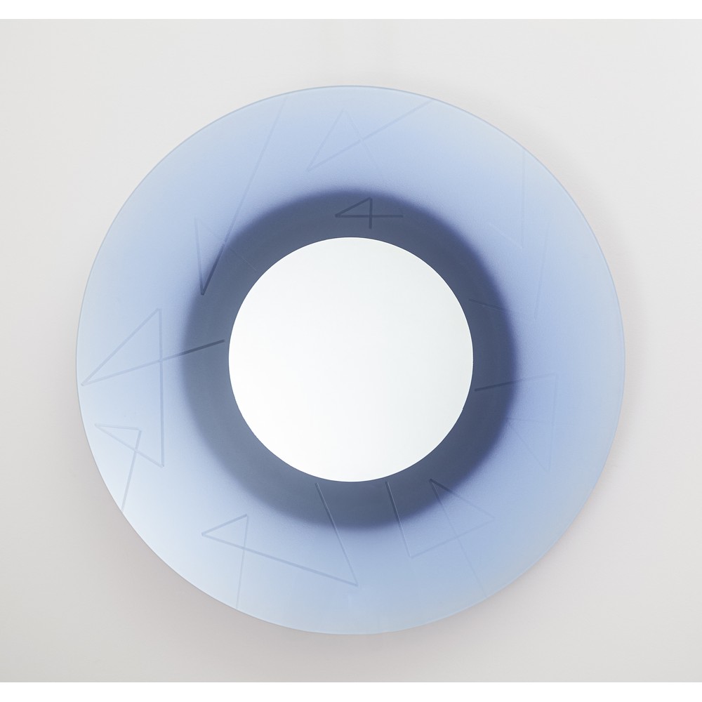 Specchio da parete circolare in cristallo con bordo retrolaccato blu e celeste con figure geometriche incise, cristallo specchiato circolare.