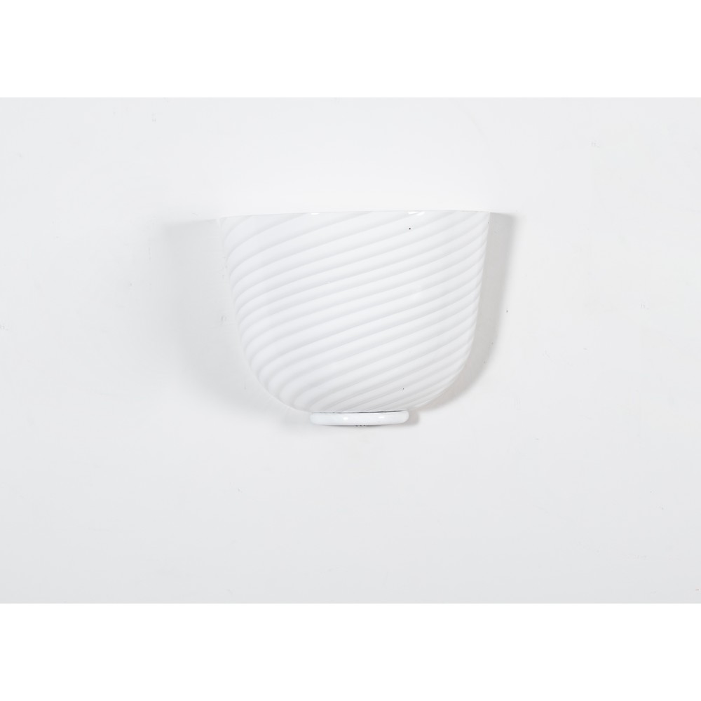 Lampada da parete ad una luce, struttura in metallo verniciato bianco, diffusore semiovale in vetro lattimo decorato con rigature diagonali.