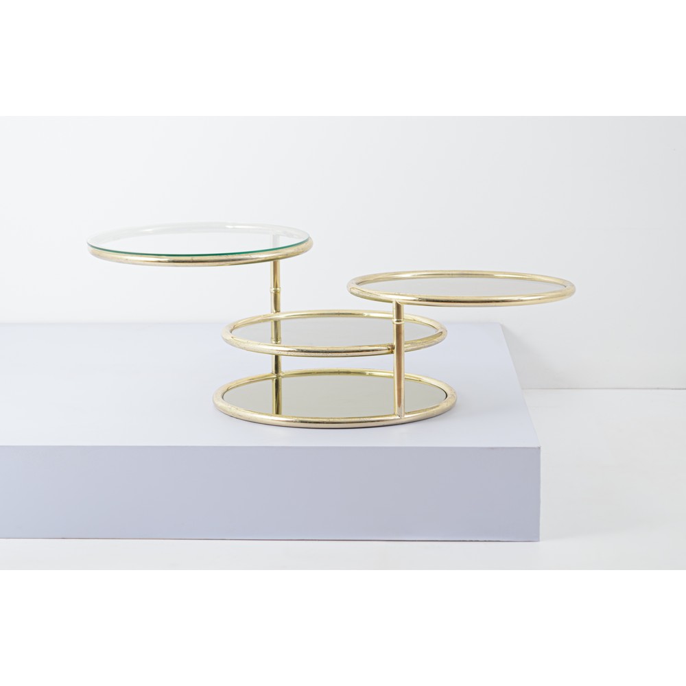 Tavolo basso circolare con struttura in tubolare di ottone, piani rotanti in vetro trasparente, piano alla base in cristallo specchiato fumè. Un vetro di diametro più grande.