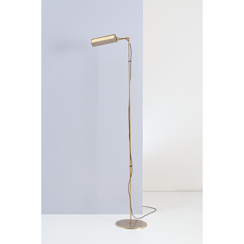 Lampada da terra ad una luce, struttura in ottone con diffusore rettangolare orientabile, base circolare. Ossidazioni.