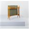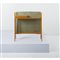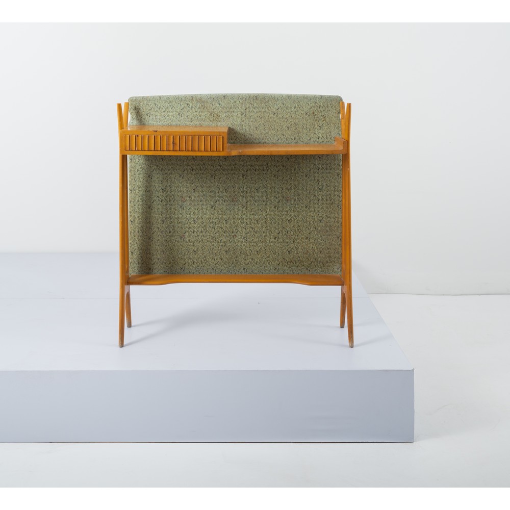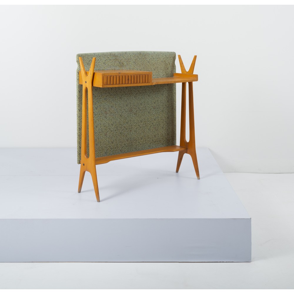 Mobile da ingresso in legno di faggio, due ripiani ed un cassetto, fianchi a coda di rondine, pannello posteriore con imbottitura e rivestimento verde.