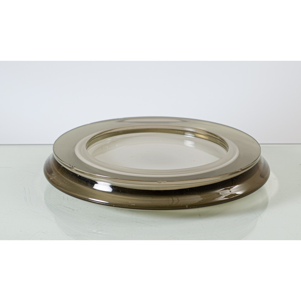 Svuota tasche in vetro sommerso grigio fumo, corpo circolare con sezione sagomata. Lievi sbeccature.