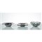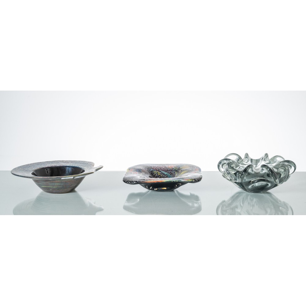 Svuota tasche in vetro nero, corpo quadrato decorato con murrine policrome; un posacenere in vetro sommerso fumè con corpo circolare e bordo ondulato; una ciotola in ceramica smaltata nera e decorata sul bordo con decori astratti blu e verdi. Firma alla base.