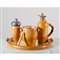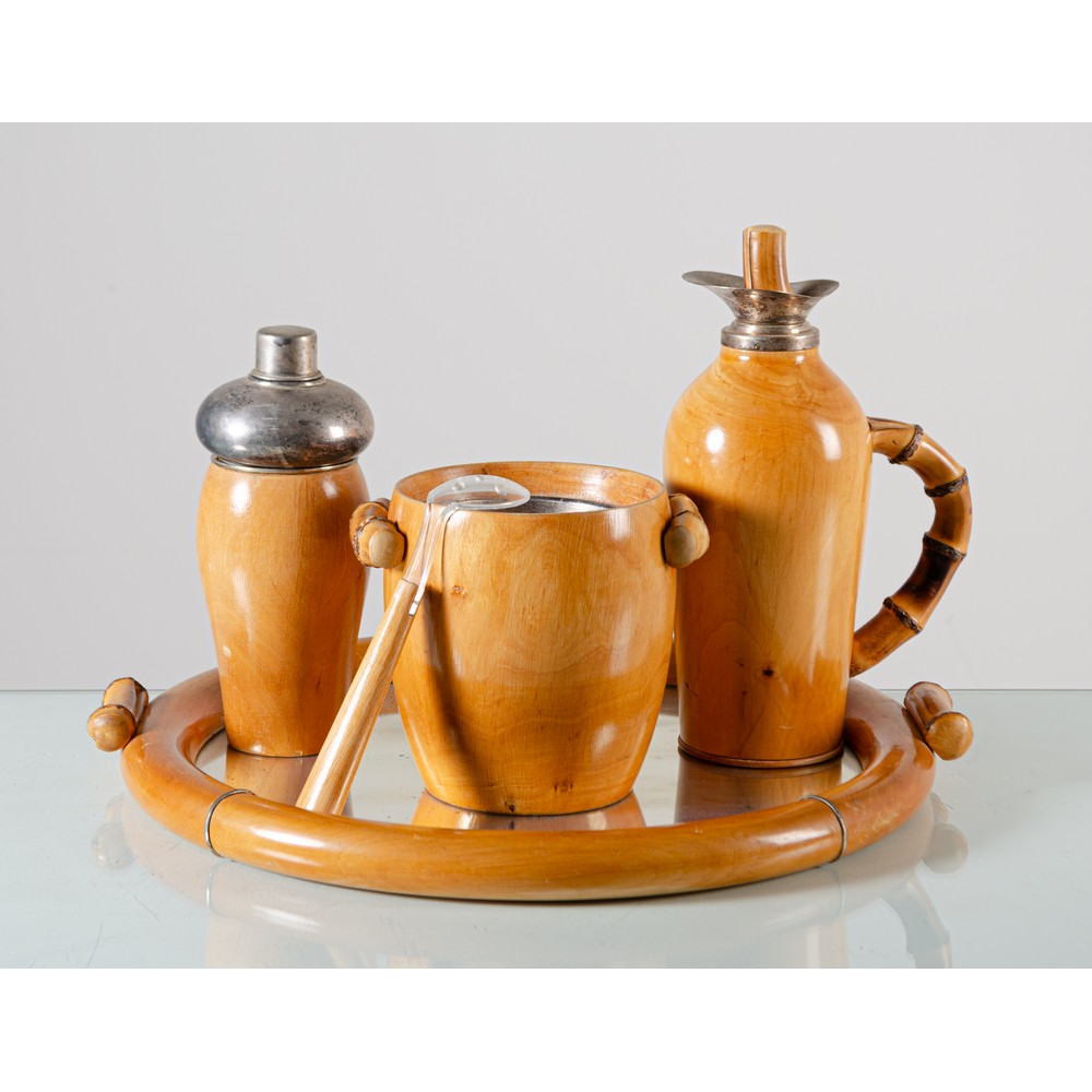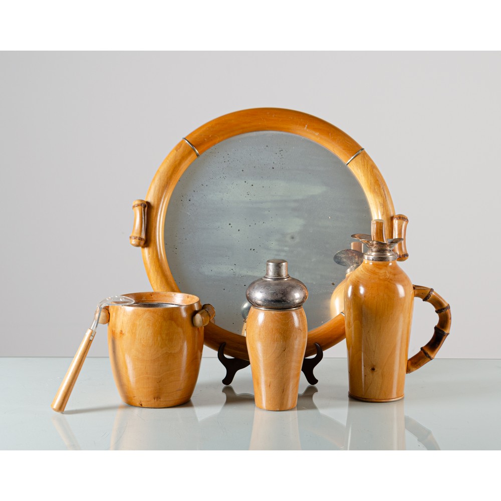 Set da bar composto da vassoio in legno, bambù e cristallo specchiato; una caraffa termica in legno, bambù e metallo; un secchiello porta ghiaccio in legno, bambù e metallo; uno shaker in legno, bambù e metallo. Difetto al sughero di un tappo.