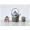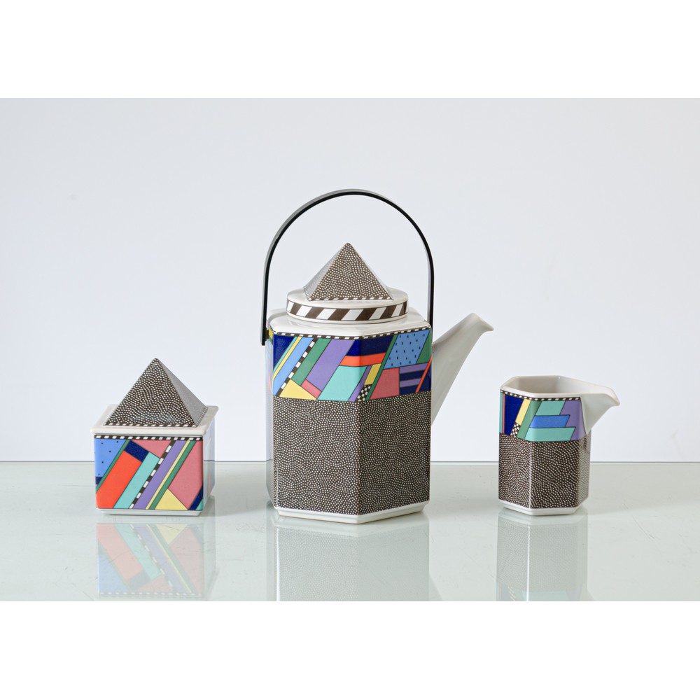Una teiera, una zuccheriera ed una lattiera in porcellana decorata in policromia con motivi geometrici. Marchio di produzione.
