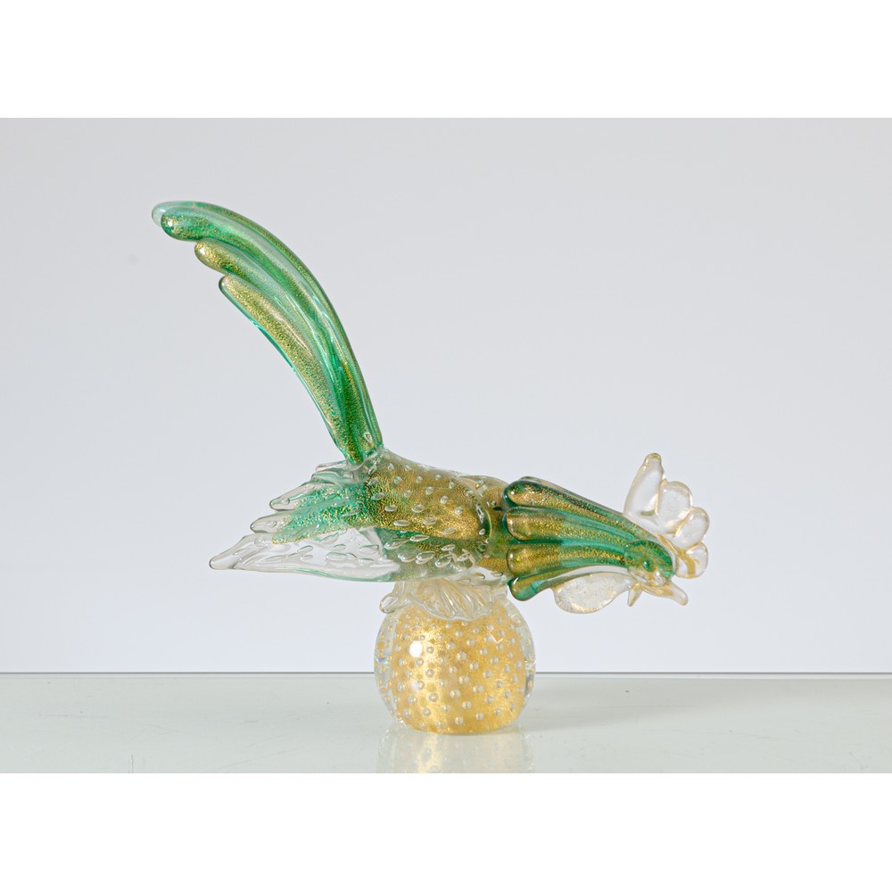 Scultura di fagiano in vetro trasparente, verde e oro, base sferica in vetro bullicante oro.