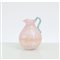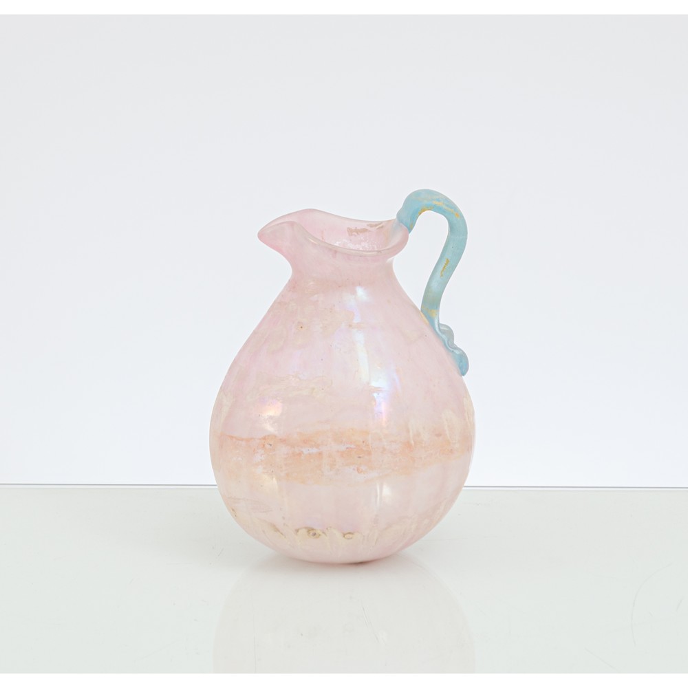 Una brocca in vetro scavo rosato e iridato, trattato all'acido, corpo a goccia con lievissime costolature, bocca estroflessa e mossa, manico in vetro azzurrino.