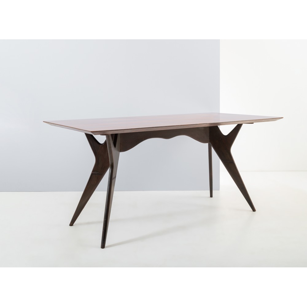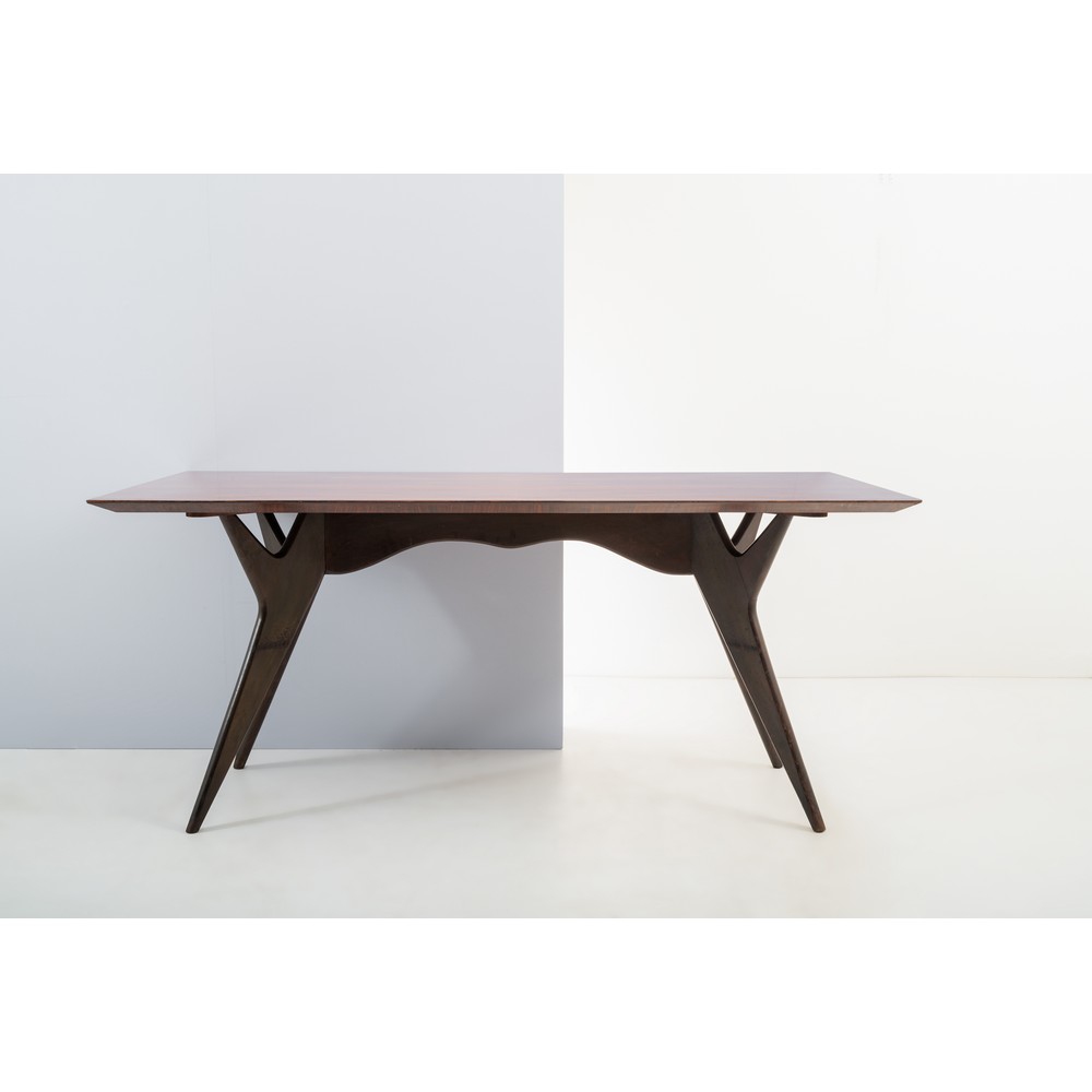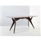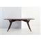 Tavolo da pranzo in legno esotico, piano rettangolare, piede a svasare con sostegno sulla parte superiore.