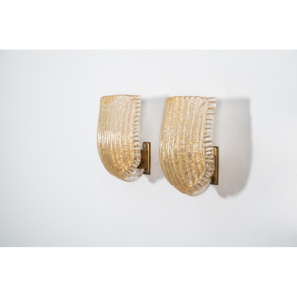 Coppia di lampade da parete ad una luce, struttura in ottone, diffusore semiovale in vetro rugiada con inclusioni oro e lavorato a costole verticali, cordonatura sui bordi.