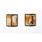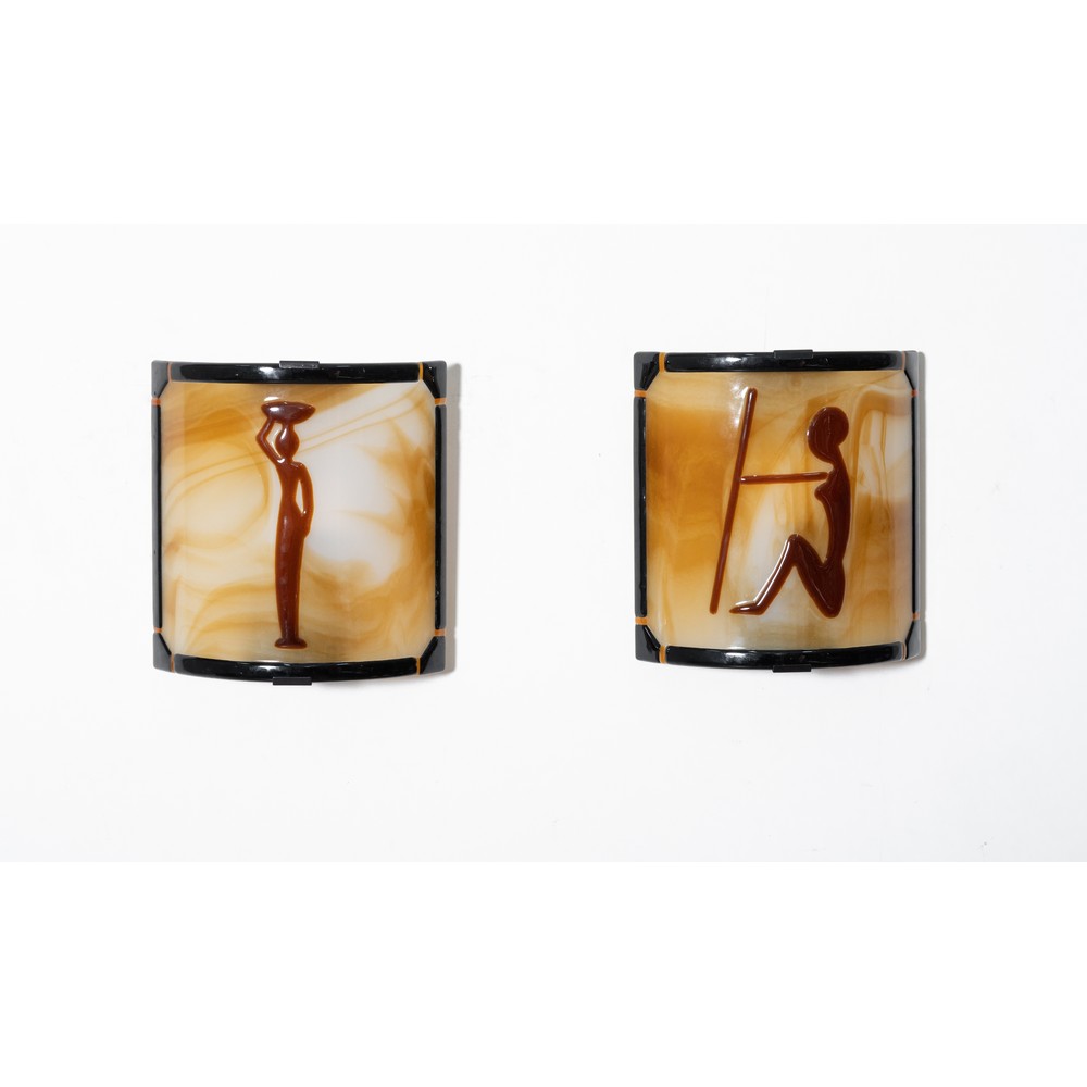 Coppia di lampade da parete ad una luce, struttura in metallo verniciato nero, diffusore curvo in pasta di vetro marmorizzata bianca e marrone, decori marroni con figure di donne tribali, cornice nera.