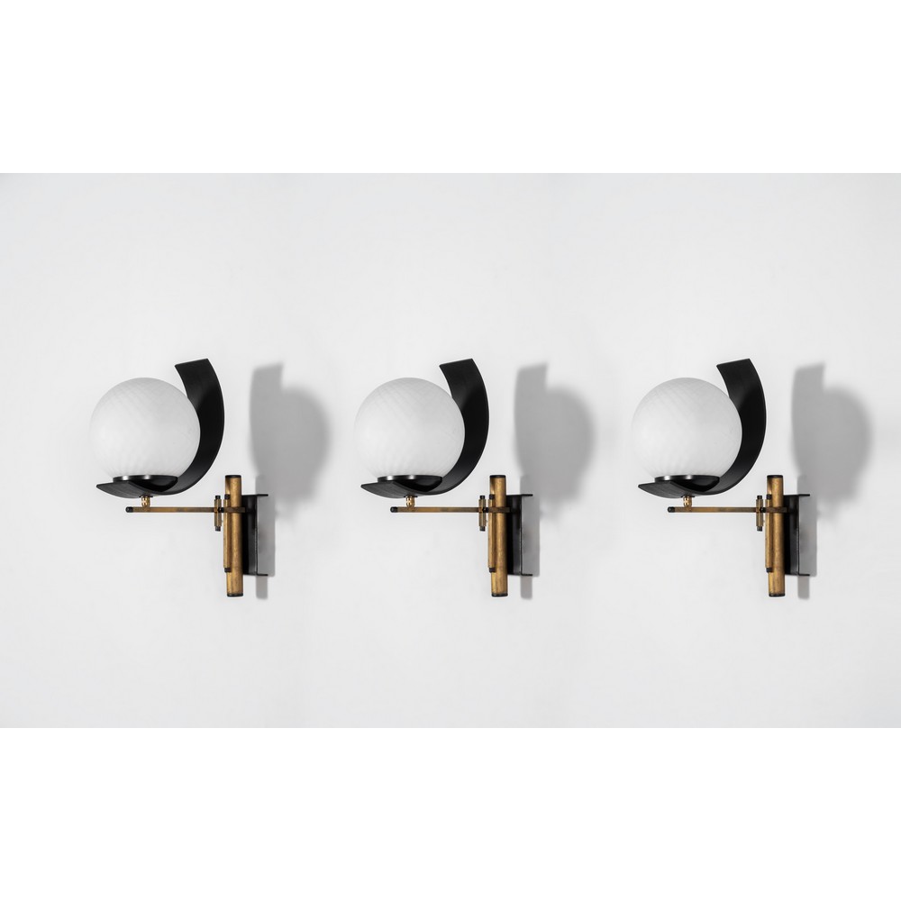 Tre lampade da parete ad una luce, struttura in ottone e ferro verniciato nero, diffusore sferico in vetro opalino bianco, legno curvato ed ebanizzato.