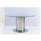 Tavolo da pranzo modello “Cidonio” con struttura in acciaio cromato, piano circolare in cristallo trasparente. Segni d’uso.