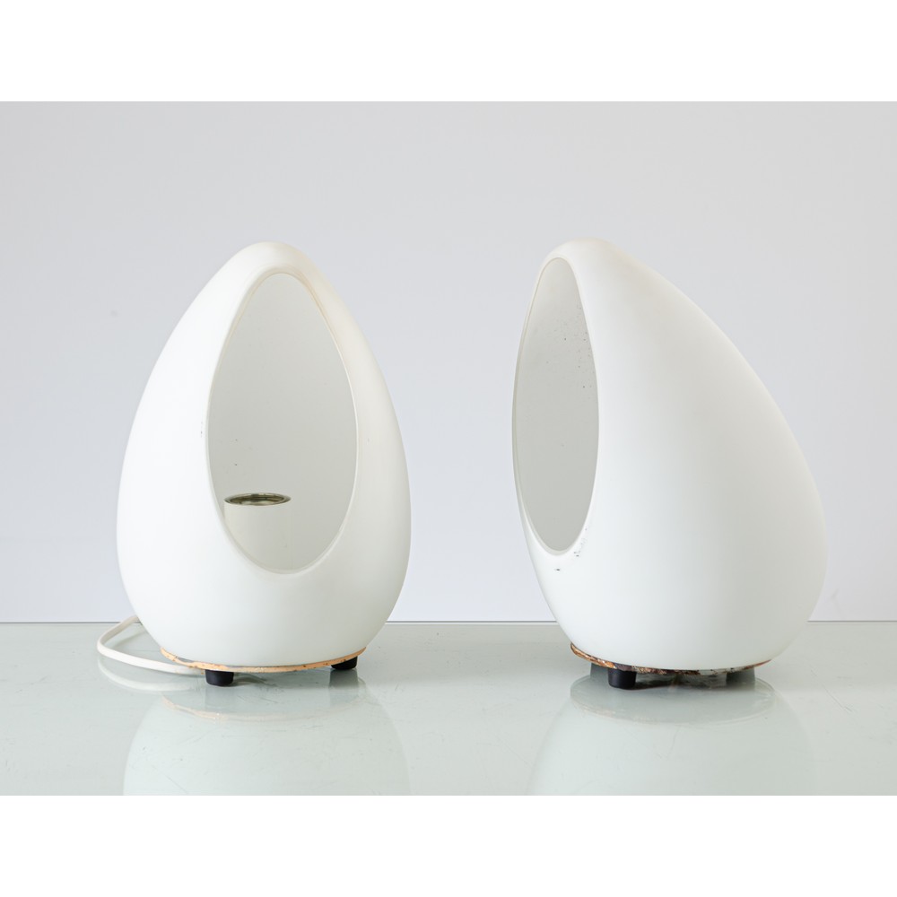 Coppia di lampade da tavolo ad una luce modello “Egg”, diffusore ad uovo in vetro opalino bianco con apertura su un fronte. Marchio di produzione.