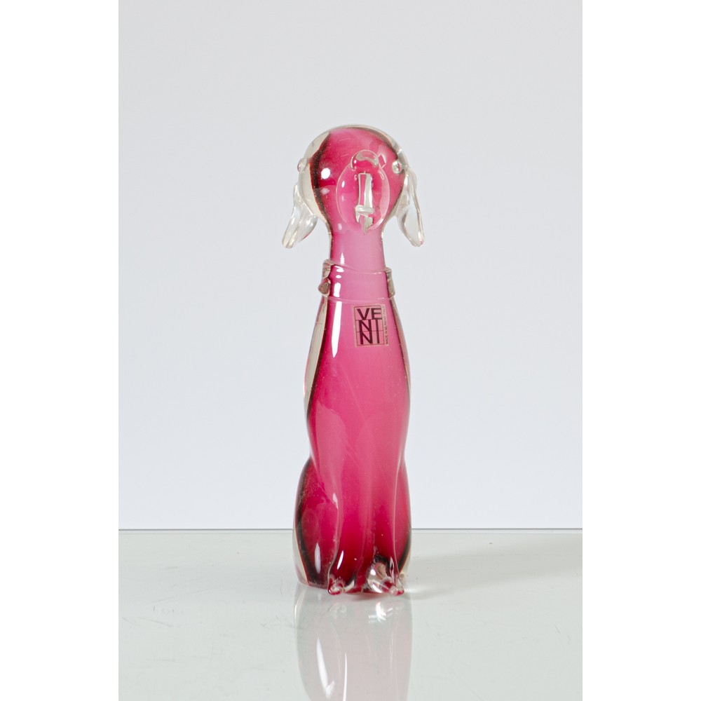 Scultura di cane seduto in vetro lilla e trasparente. Firma ed etichetta di produzione.