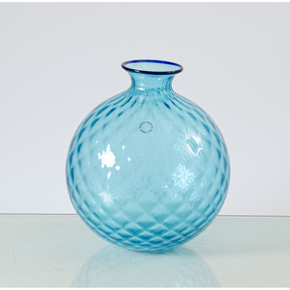 Un vaso della serie “Balloton” in vetro soffiato acquamare con collo bordato zaffiro. Firma a punta Venini 2003.