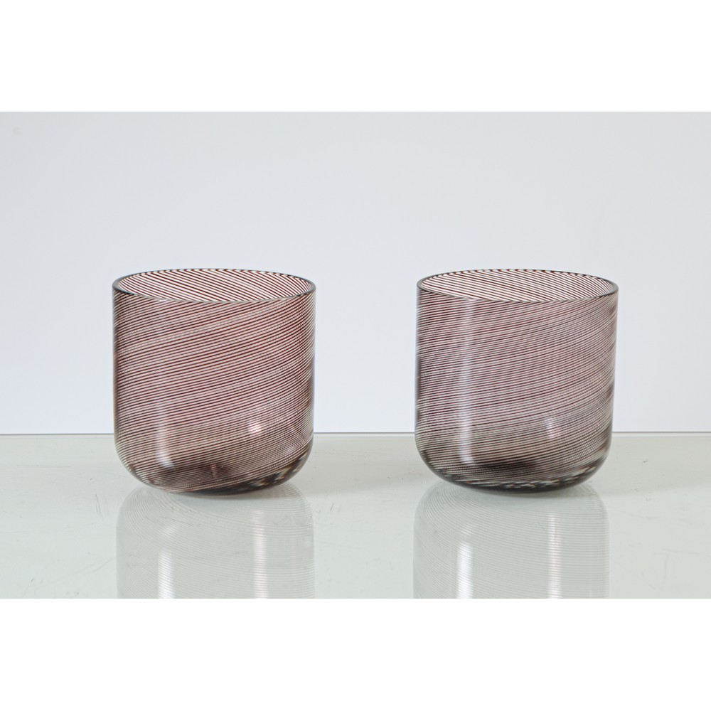 Coppia di coppe in vetro soffiato trasparente e decorato con filigrana melanzana, corpo cilindrico con bocca piana circolare. Firma alla base e datati 1979.