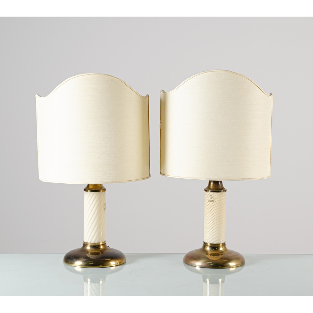 Coppia di lampade da tavolo ad una luce, struttura in ottone, stelo in canna di vetro avorio decorata con rigature diagonali, paralume in tessuto avorio.