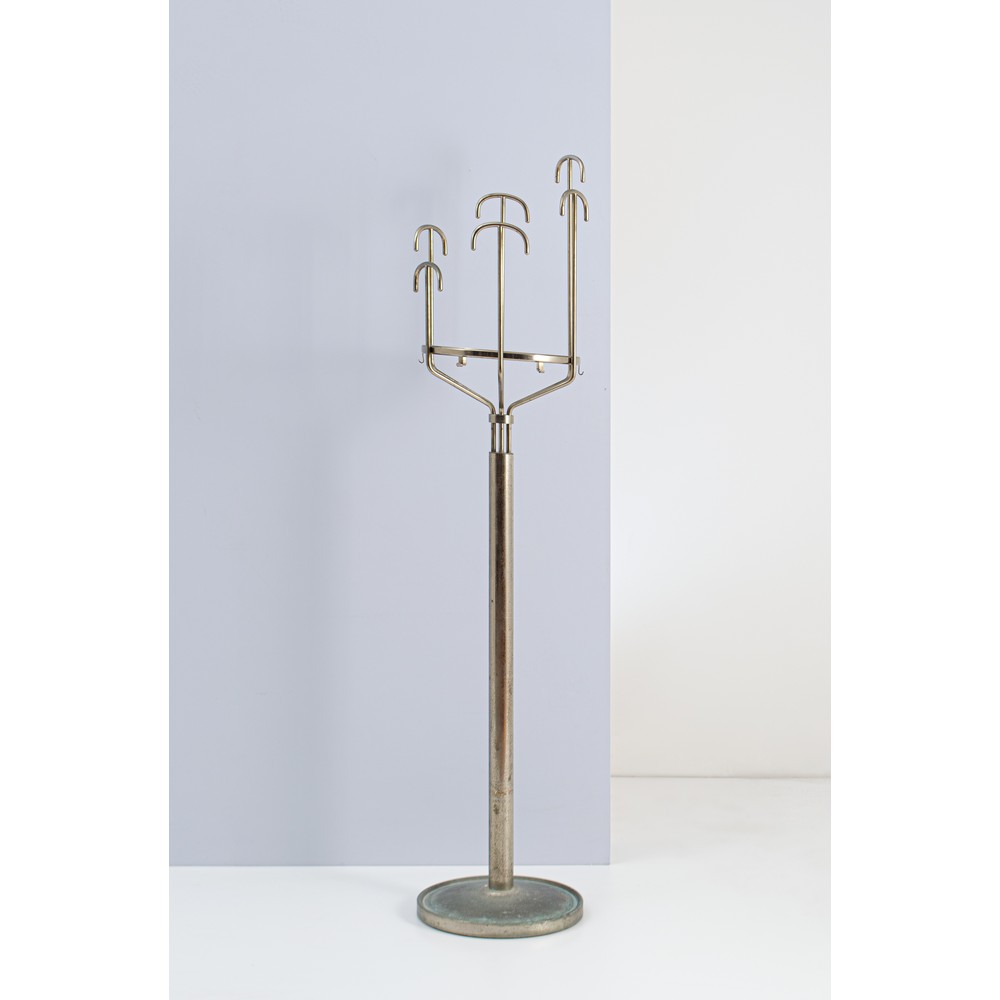 Appendiabiti modello “Melpomene”, struttura in acciaio composta da fusto centrale e sei appendini a scalare. Base circolare. Ossidazioni.