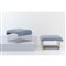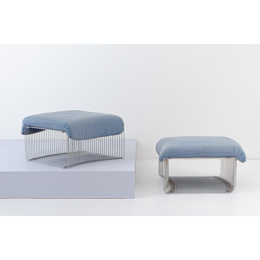 Coppia di sedute poggiapiedi con struttura in tubolare di acciaio cromato, seduta con imbottitura e rivestimento in tessuto originale nei toni denim.
