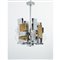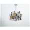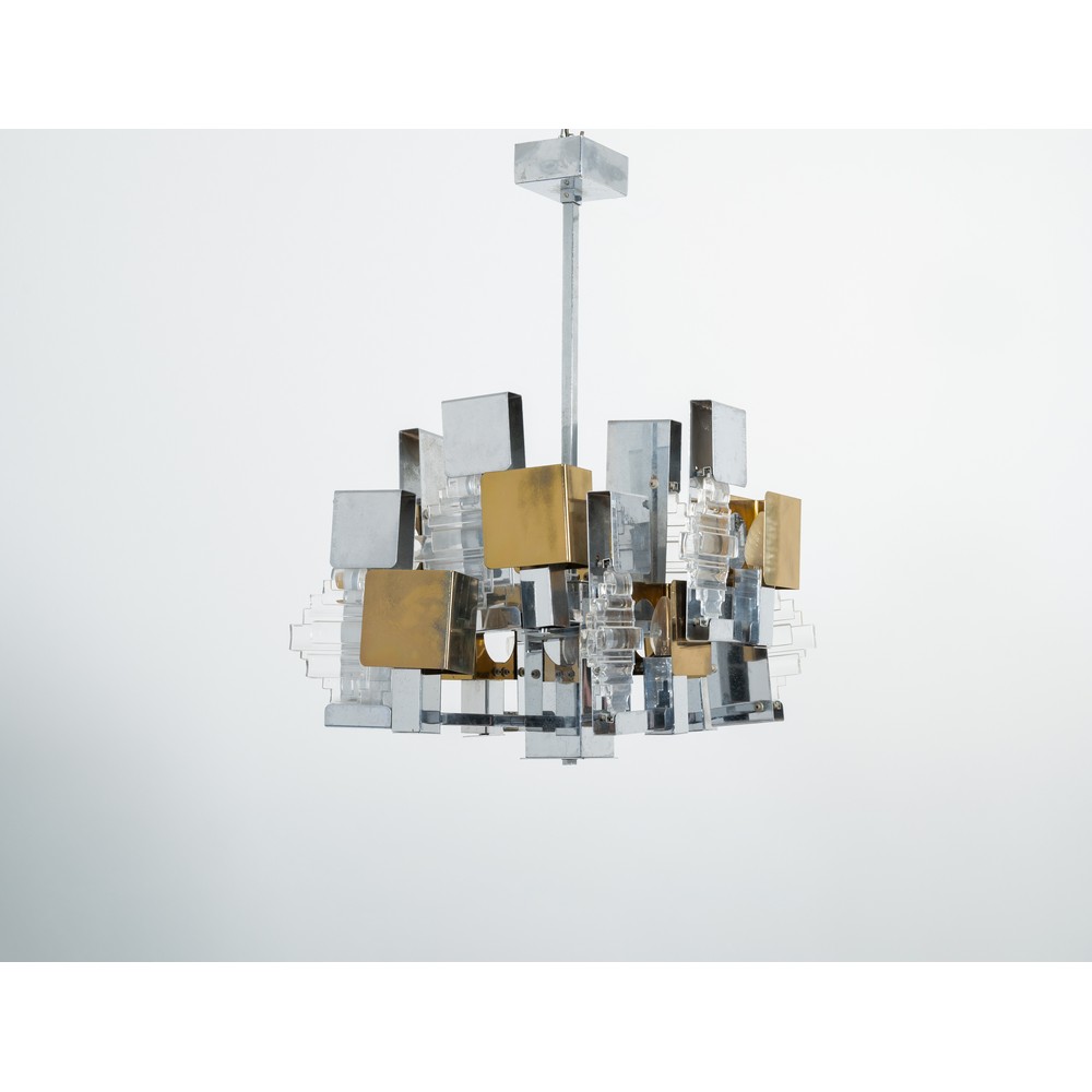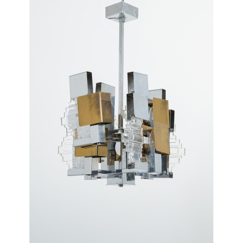 Lampada a sospensione a otto luci, struttura geometrica in acciaio cromato, ottone, diffusori a formella in vetro trasparente a stampo.