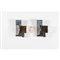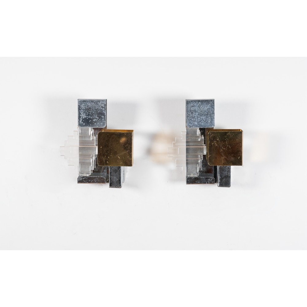 Coppia di lampade da parete ad una luce, struttura geometrica in acciaio cromato, ottone, diffusori a formella in vetro trasparente a stampo.