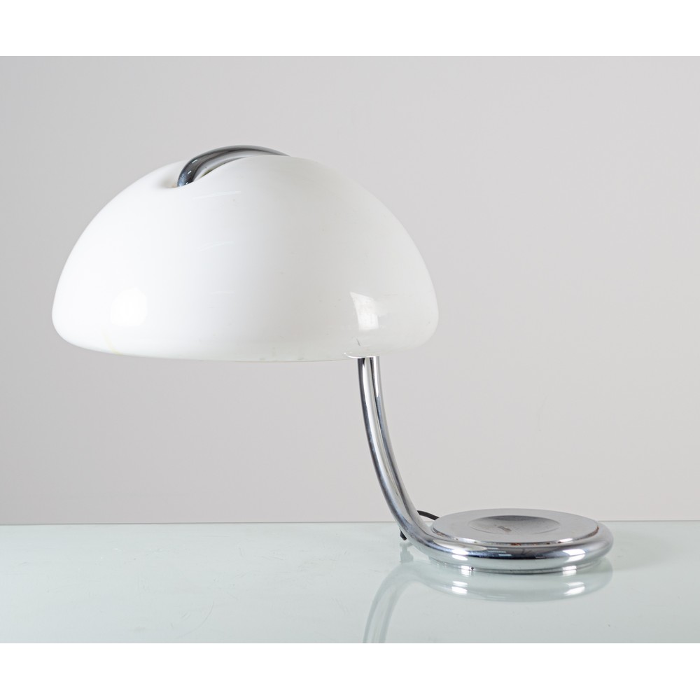 Lampada da tavolo ad una luce modello “599 Serpente” con struttura in tubolare di acciaio, diffusore semisferico in perspex bianco. Base circolare in acciaio cromato. Segni d’uso e una piccola ammaccatura al diffusore.
