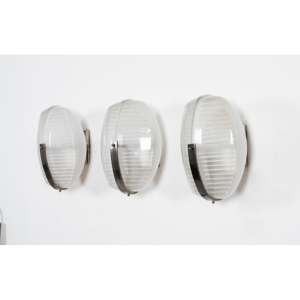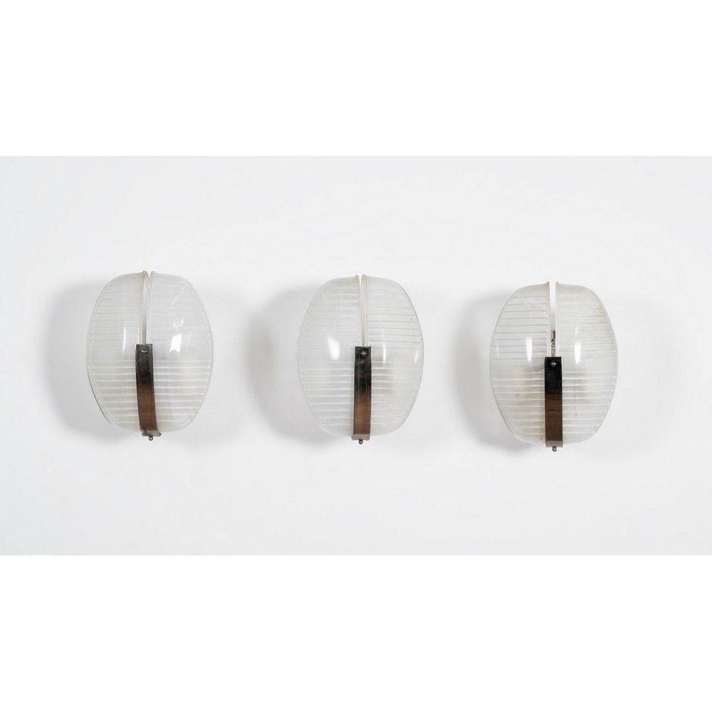 Tre lampade da parete a due luci modello “Lambda”, struttura in ottone cromato, diffusore in cristallo satinato e stampato.