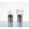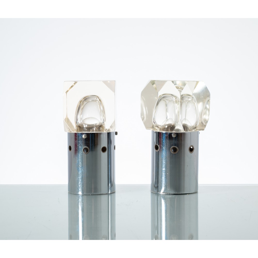 Coppia di lampade da tavolo ad una luce, struttura cilindrica in acciaio cromato, diffusore in vetro sfaccettato di grosso spessore trasparente.