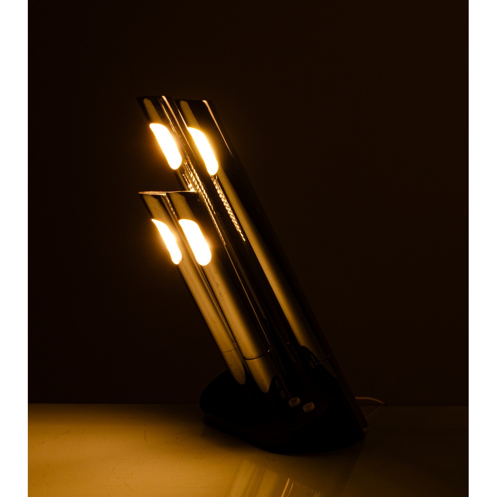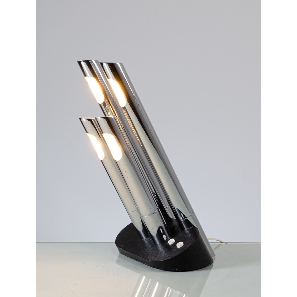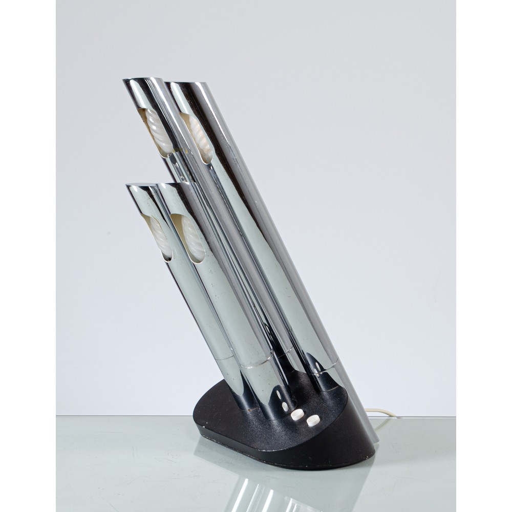 Lampada da tavolo a quattro luci modello “President”, base in ghisa con diffusori cilindrici in metallo cromato, doppio interruttore di accensione. Marchio di produzione.