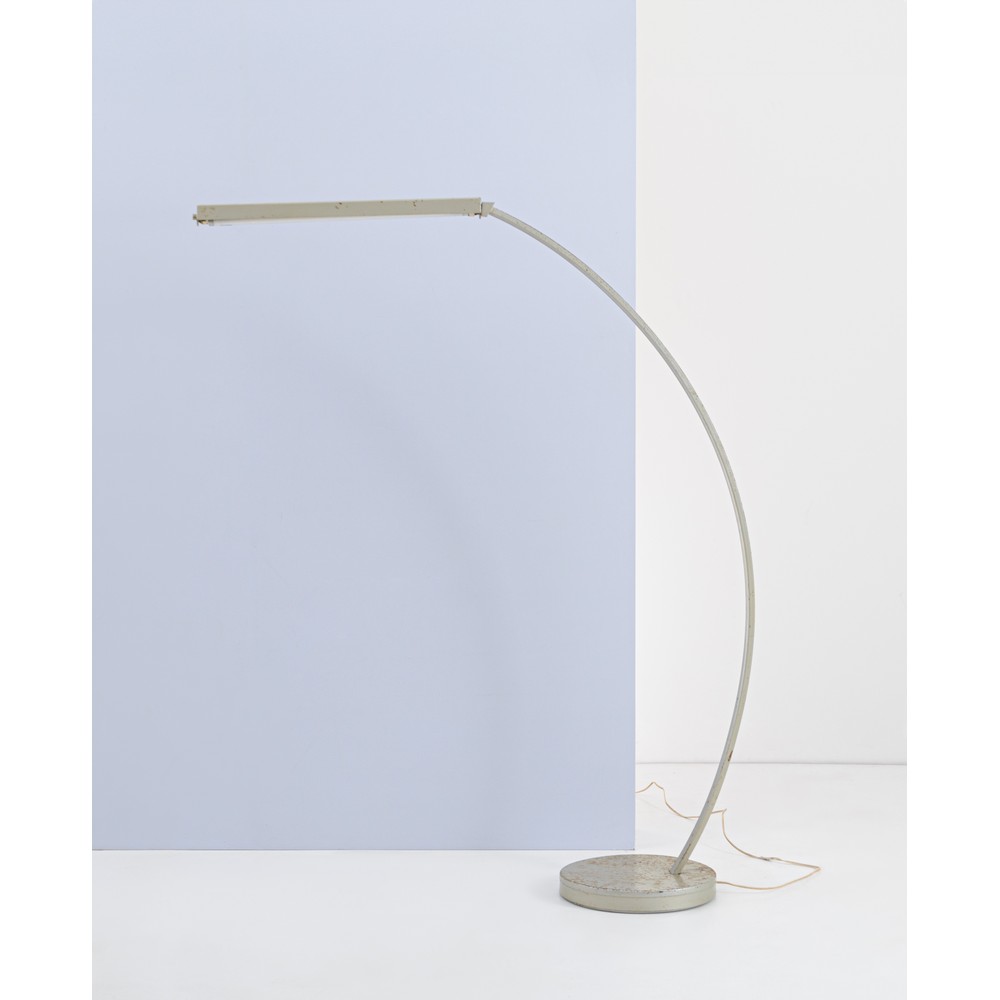 Lampada da terra ad una luce, struttura ad arco in metallo verniciato grigio con diffusore orientabile, base circolare. Ossidazioni e tracce di ruggine.