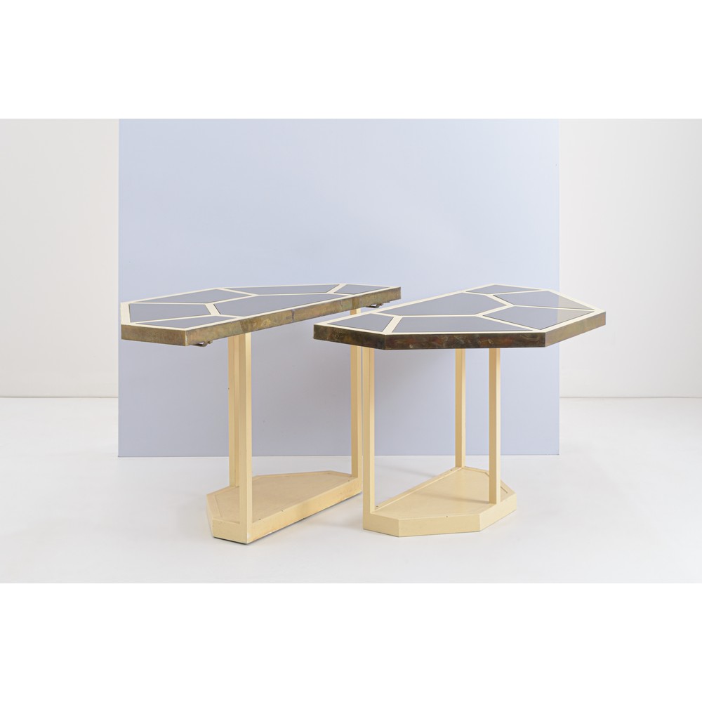 Coppia di consolle-tavolo modello “Puzzle” con struttura in legno verniciato avorio, ottone, piano sfaccettato con vetri specchiati fumè incassati. Segni di uso e graffi.