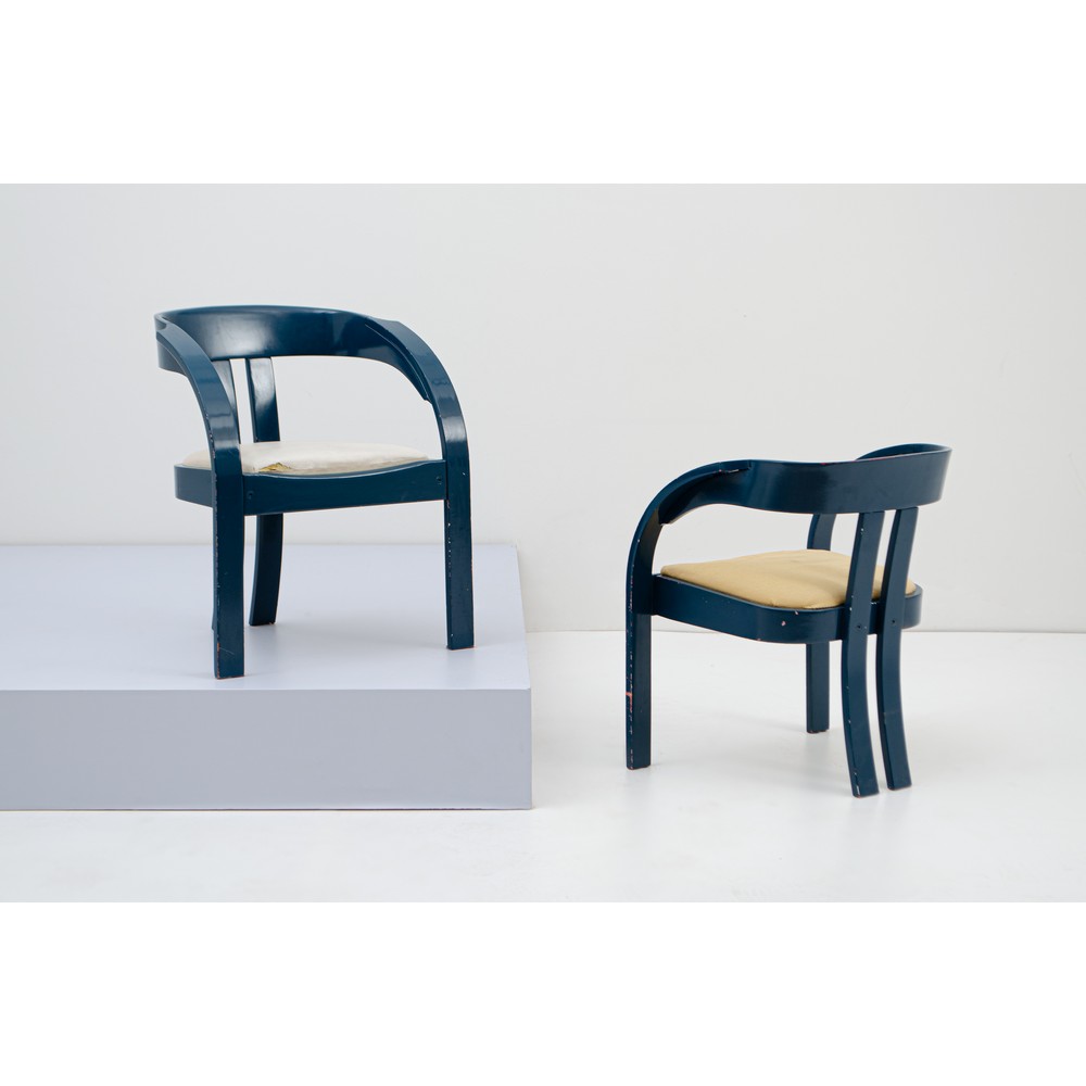 Due poltrone modello “Elisa” in legno laccato blu, una seduta con imbottitura e rivestimento in tessuto chiaro e una in similpelle. Graffi e sedute da rifare.