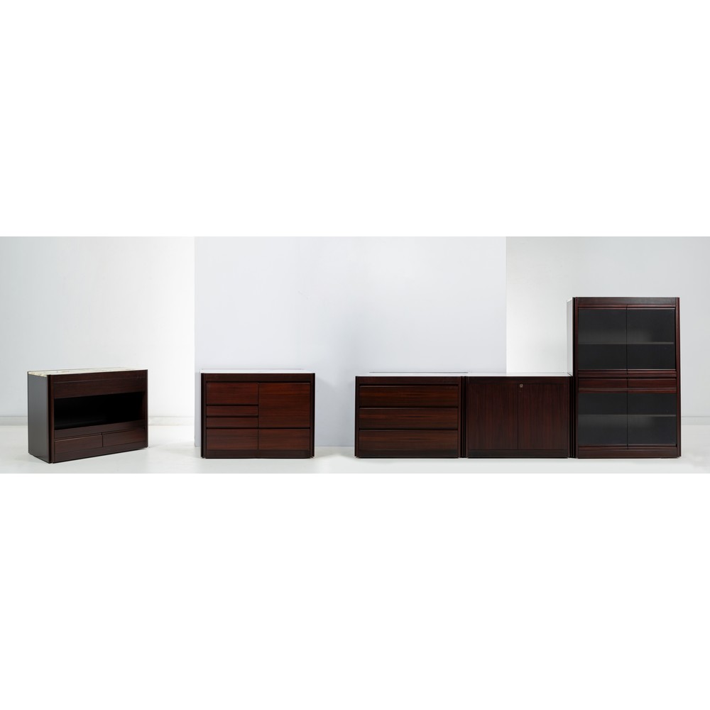 Cinque mobili contenitori con ruote della serie “4D” in legno lamellare impiallacciato esotico, uno con vano chiuso, ripiano centrale e ante a battente con chiusura, piano rettangolare in marmo di Carrara incassato; uno con tre cassetti e piano rettangolare in marmo di Carrara incassato; uno a doppia altezza con due ripiani centrali, quattro ante battenti in vetro, piano superiore rettangolare in marmo di Carrara incassato; uno con vano chiuso, ripiano centrale e sei cassetti di altezze differenti, piano rettangolare in marmo di Carrara incassato; uno con vano a giorno, due cassetti sottostanti, piano rettangolare in marmo di Carrara incassato e forato con tre circonferenze porta bottiglie e una foratura più grande per porta ghiaccio e sedici piccole forature portafiori.