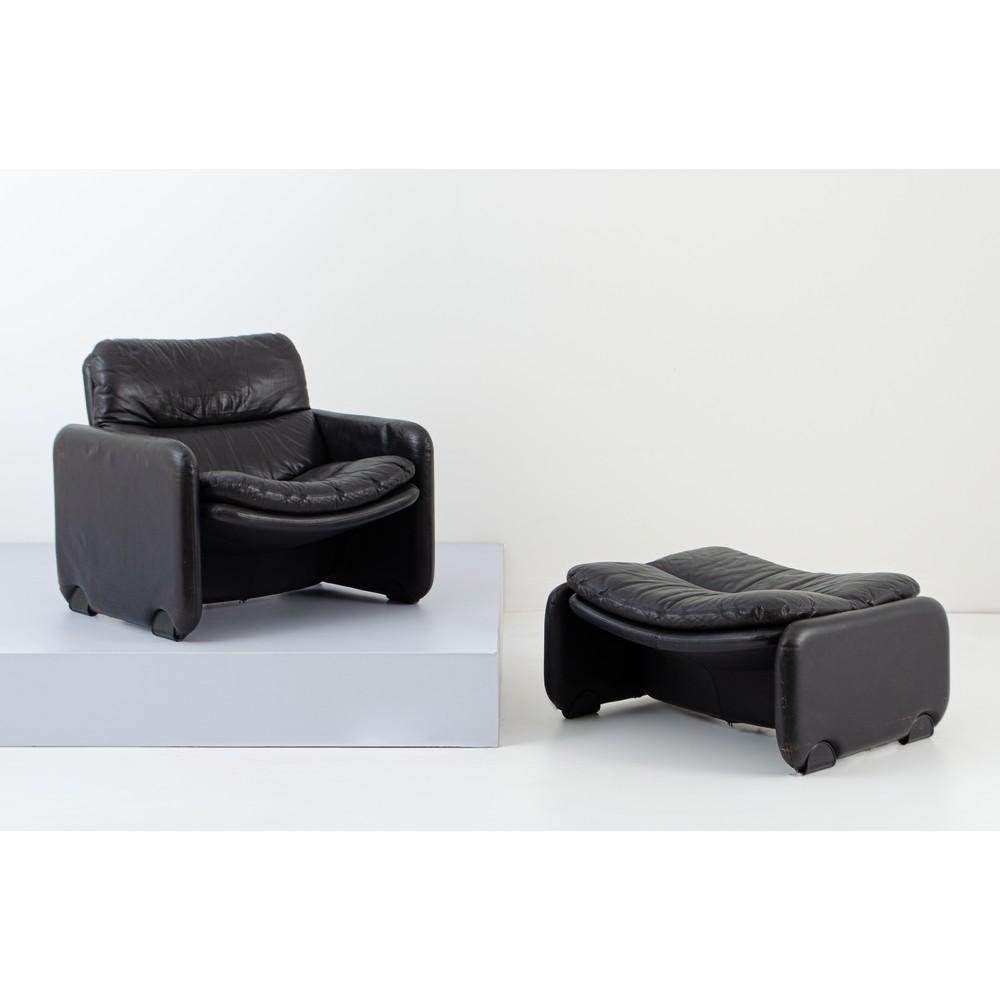 Poltrona con poggiapiedi modello “Sandwich e doppio Sandwich”, struttura in ferro e legno con imbottitura e rivestimento in pelle nera. Segni d’uso.