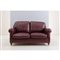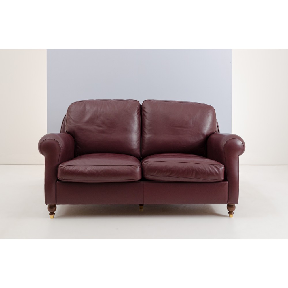 Divano a due posti modello "George", struttura in legno con imbottitura in fibra naturale, rivestimento in pelle prugna, cuscini nella seduta e spalliera. Piedi in legno. Marchio di produzione e certificati di origine.