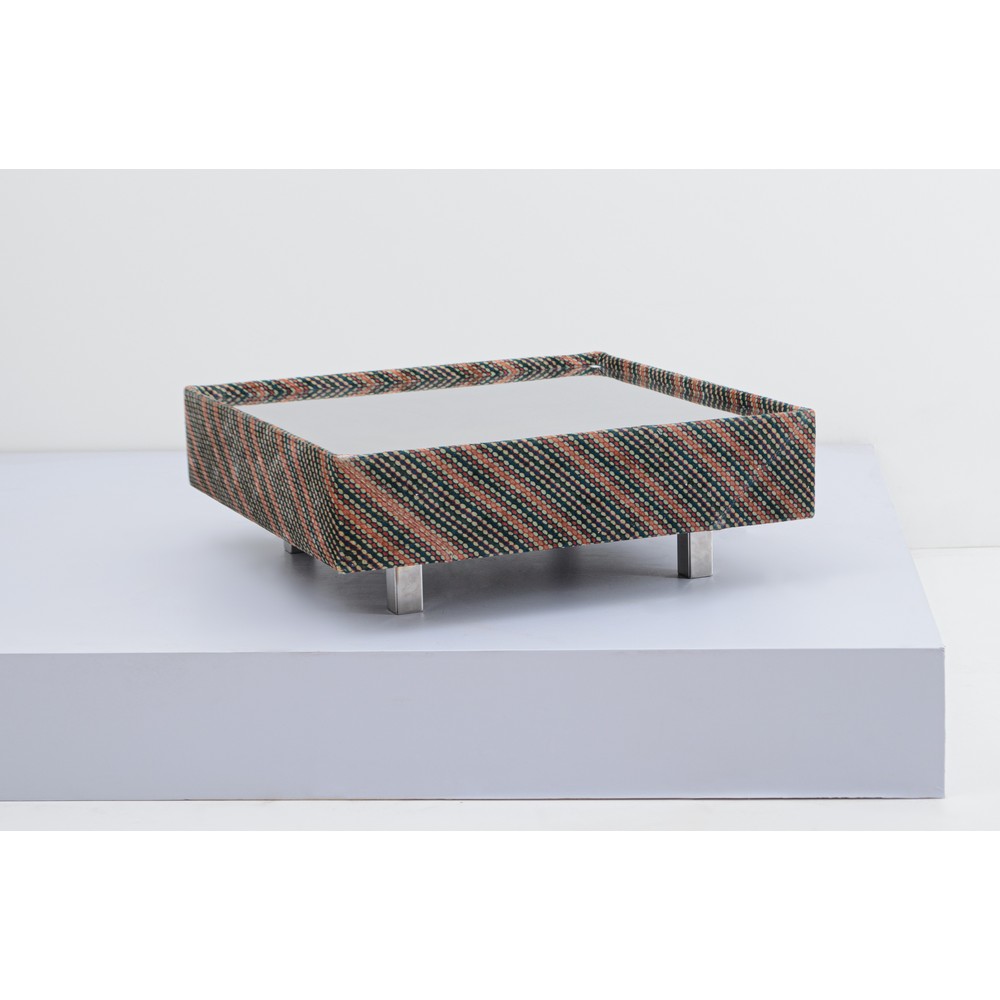Tavolo basso con struttura in legno, con fascia perimetrale rivestimento in tessuto originale a motivi geometrici blu, rosso e panna, piano in metallo specchiato. Graffi e usure.