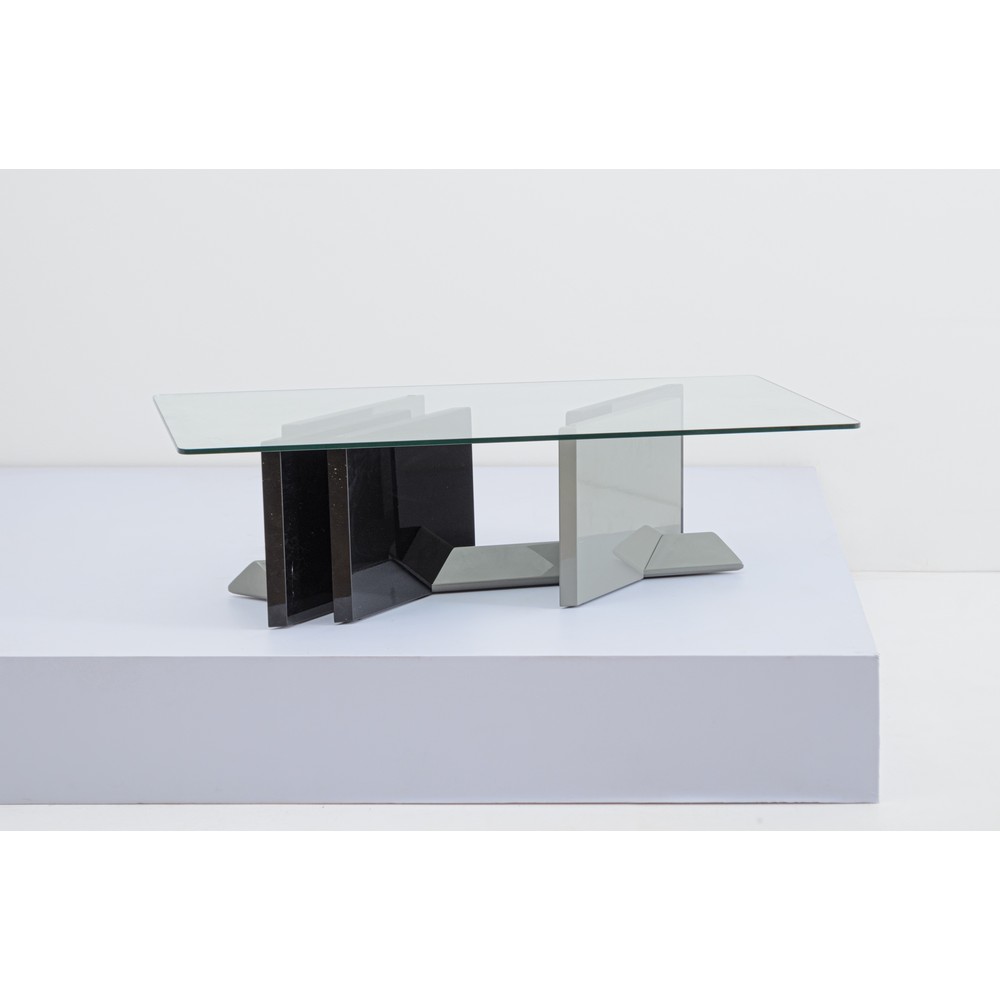 Tavolo basso con piede composto da lastre in legno laccato nero e grigio, piano rettangolare in cristallo trasparente.