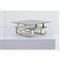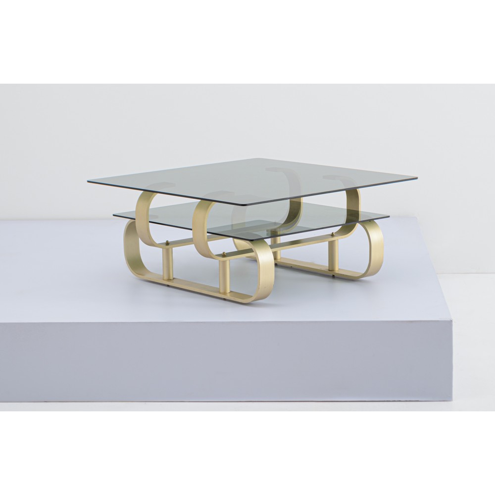 Tavolo basso con struttura in alluminio dorato, piano e sottopiano quadrati in vetro fumè, gambe curvate.