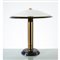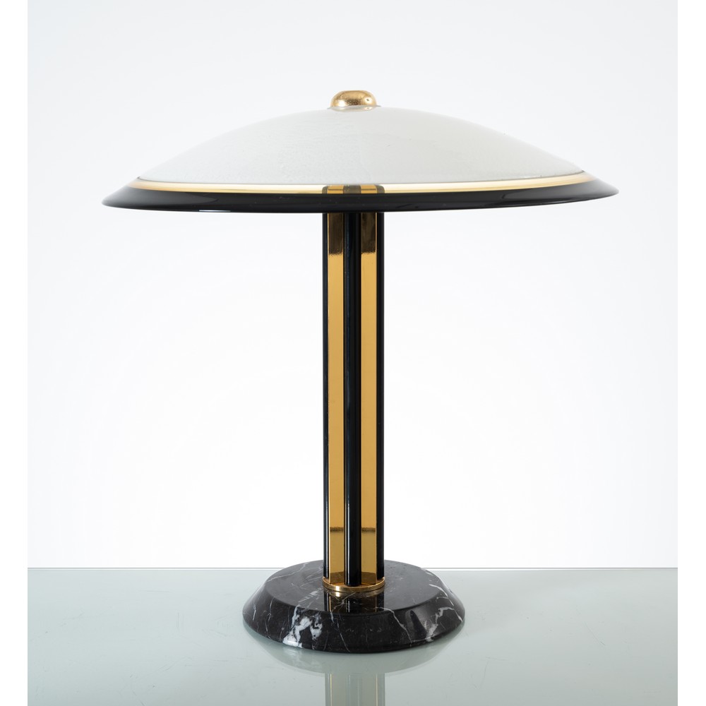 Lampada da tavolo ad una luce, struttura in ottone e metallo verniciato nero, diffusore semisferico in vetro lattimo, ambra e nero, base circolare in marmo nero Marqunia.