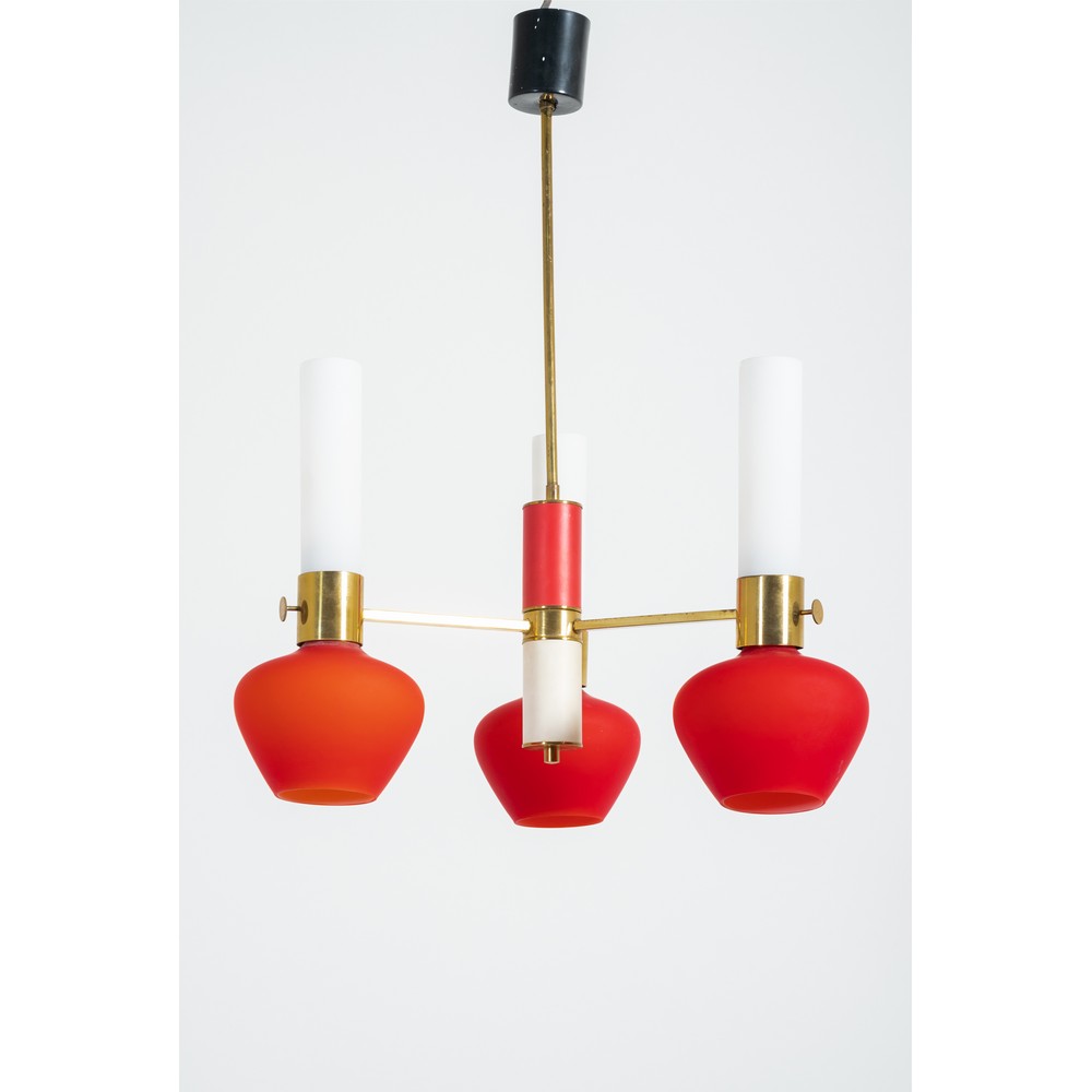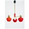 Lampada a sospensione a sei luci, struttura in ottone e metallo verniciato rosso e bianco, diffusori a cipolla in vetro satinato rosso.