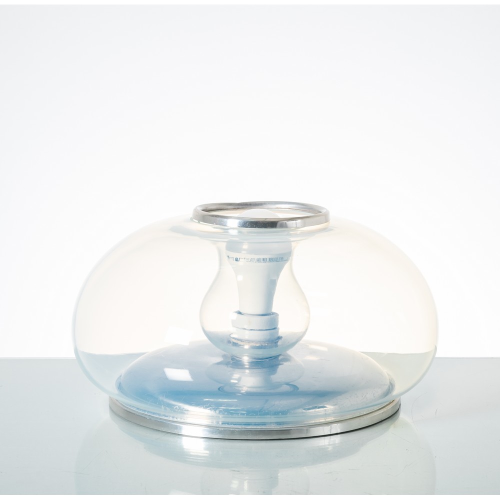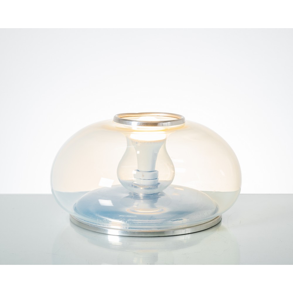 Lampada da tavolo ad una luce , struttura in metallo cromato, diffusore sferico schiacciato in vetro trasparente iridato con cavità centrale. Sbeccatura nel vetro interno.