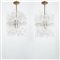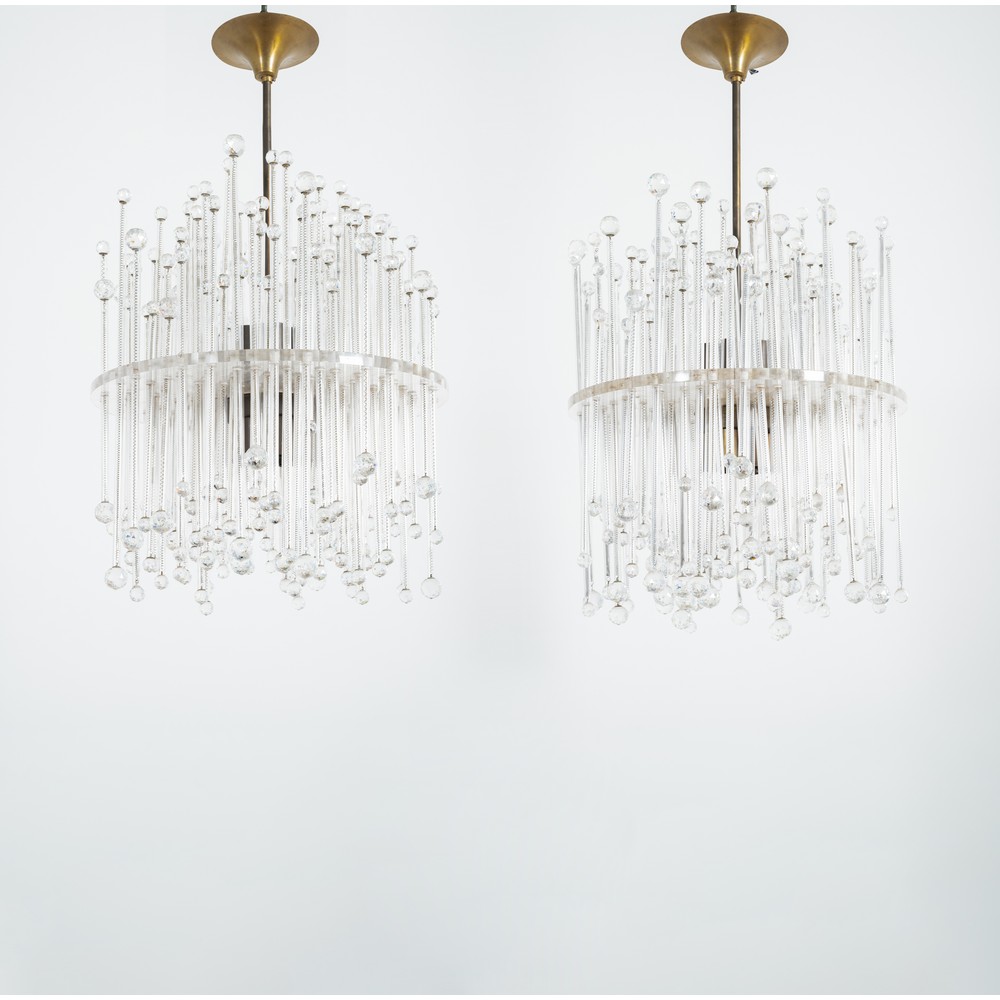Coppia di lampade a sospensione a dodici luci con struttura in metallo, diffusore composto da un disco circolare in plexiglass forato da cui fuoriescono tubi in vetro animati da molla metallica con sfere in cristallo sfaccettato trasparente alle estremità.